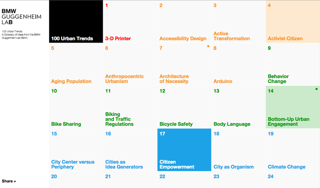 The BMW Guggenheim Lab, a traveling think tank/community discussion space, released today their latest list of urban trends, gleaned from almost six months’ worth of workshops held in Mumbai, Berlin, and New York City. From Container Architecture to Data Visualization, Crowdsourcing to Urban Data, many of these trends — discussion points, really — pop up frequently.