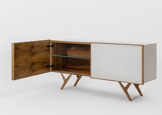 A 3mm concrete veneer never before seen in furniture applications, creates functional, elegant pieces with the cool, smooth touch and the solid look of concrete, contrasted with timber details.