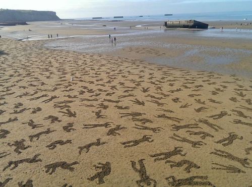 An installation, called “The Fallen 9000”, was organized by British artists Jamie Wardley and Andy Moss of Sandinyoureye to commemorate the civilians, Germans and allied troops who died during the D-Day landings of WW2 on June 6, 1944. More than 500 volunteers used stencils to draw 9,000 figures on a beach in Arromanches, France, bringing home the scale of loss. The installation was swept away a few hours later by the tide.