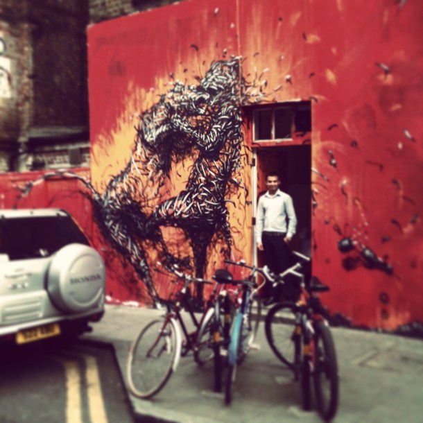 On a Sunday photowalk round and about Brick Lane, London. Came across street art by Chinese-born, SA-based artist, DALeast #happy